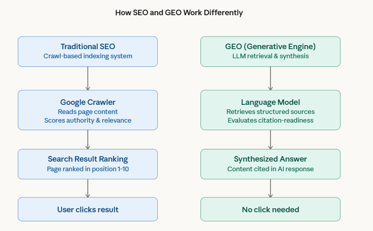 GEO works differently. A language model does not rank pages. It synthesizes content from sources it was trained on, or that a retrieval layer feeds it at query time. If a client’s content is not structured for citation, the model ignores it regardless of domain authority.